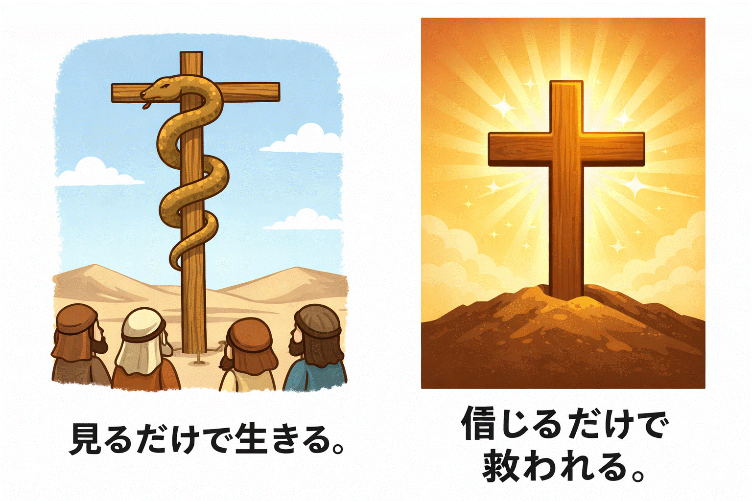 昔の出来事 今から約3500年前.イスラエルの人々は、天の神に逆らい、毒ヘビにかまれて、多くの人々が、命を失いました。そこで人々は、祈りの人、モーセに助けを叫び求めました。神はモーセに、青銅のヘビを作り、それを旗竿にかかげるように命じました。神は、これを見る者は生きる。と言われました。モーセの言うとおり、それをあおぎ見た人は、死ぬことなく、みな助かりました。「信じて、見ただけです。」